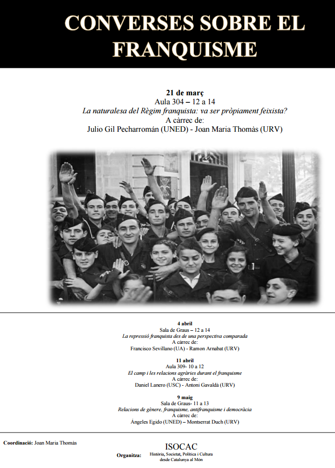 Ell 21 de març a l'aula 304 del Campus Catalunya es celebrarà la primera sesió, portarà per títol: La naturalesa del Règim franquista: va ser pròpiament feixista?